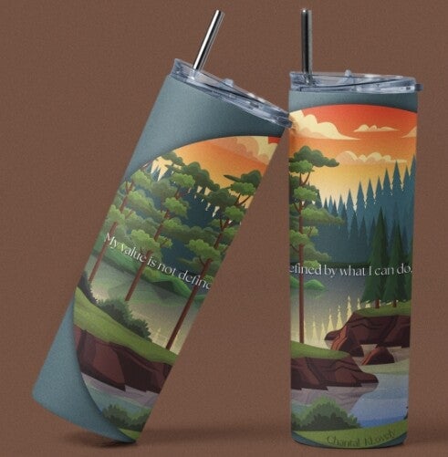 Embrace stillness, worth, and inner peace with this calming 20oz tumbler, designed to remind you that your value is not in your output—but in your presence. Set against a warm, earthy brown background, the tumbler features a peaceful lakeside scene with gentle trees and calm waters, symbolizing reflection, depth, and self-acceptance.