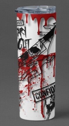 For lovers of the dark side—this 20oz stainless steel tumbler is dripping (literally!) with crime scene chaos. It starts with a blood-drip rim at the top, flowing into a chilling collage: