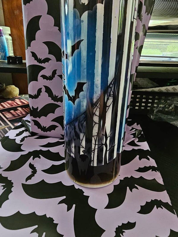The bottom of the print on the cup misprinted & burned a bit. The cup is still in perfect condition, works perfectly, the design is just a little flawed on the bottom.