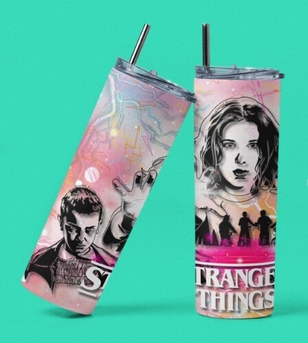 Celebrate the power, growth, and iconic style of Hawkins’ fiercest heroine with the Stranger Things 20 oz “Evolution of Eleven” Tumbler, available exclusively at KLovely Designs. Set on a vibrant pink background, this design bursts with electric neon lightning accents that capture the unmistakable energy Eleven brings to every season.